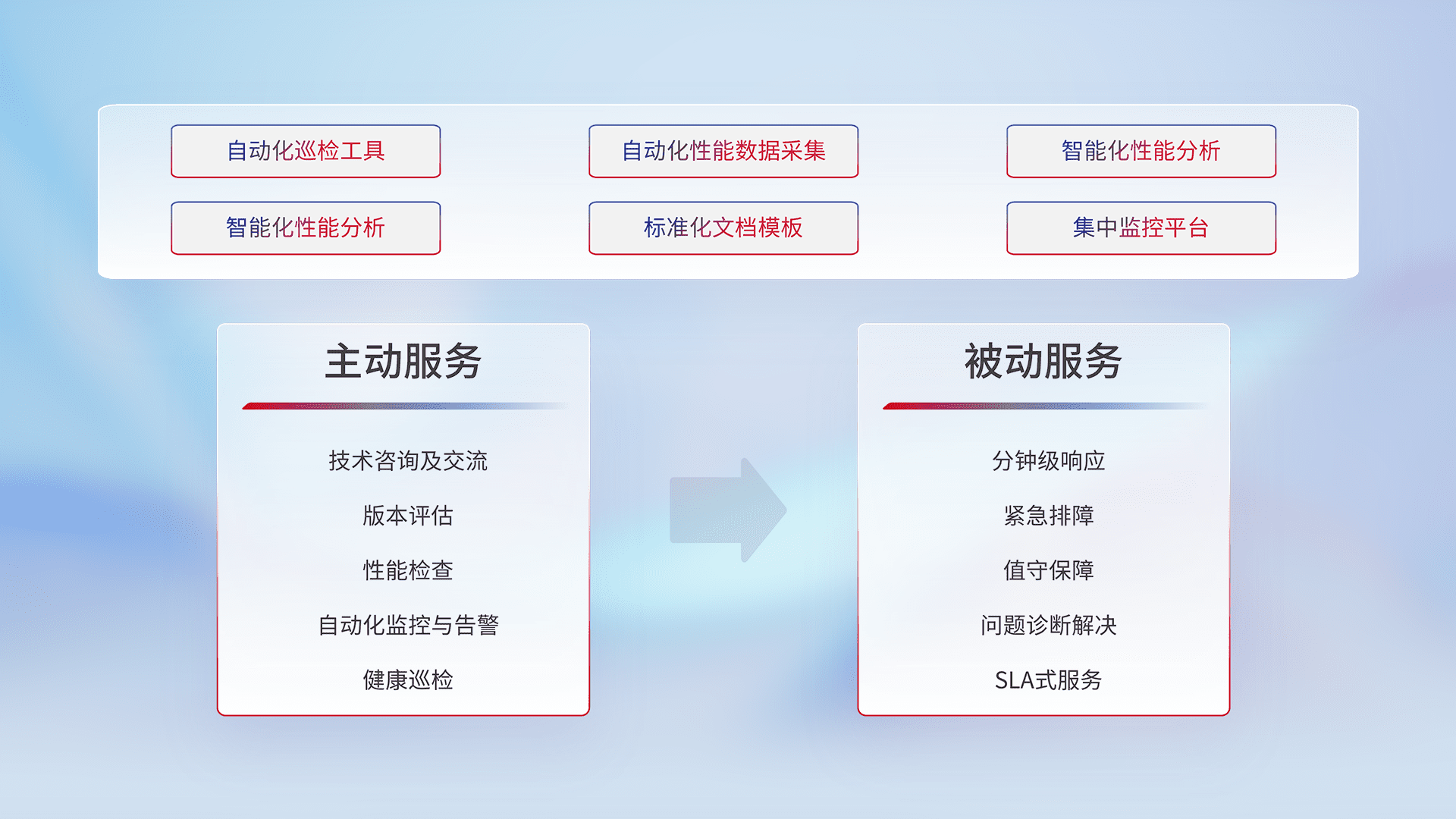 智能化工具和标准化文档,,,,保障服务质量,,提供主动服务(包含技术咨询、、、版本评估、、性能检查、、、自动化监控与告警、、健康巡检)和被动服务包含(分钟级响应、、、、紧急排障、、、值守保障、、问题诊断解决、、、SLA服务)。。。。