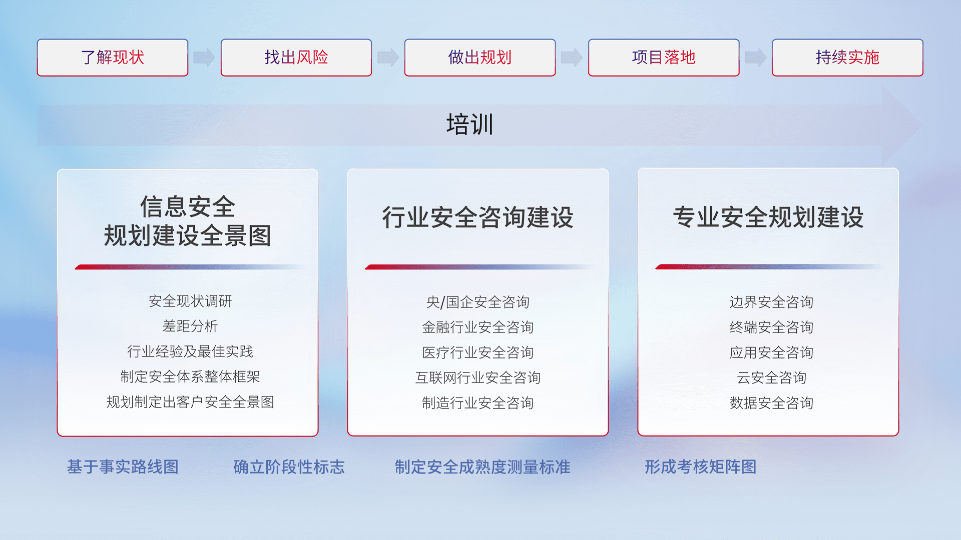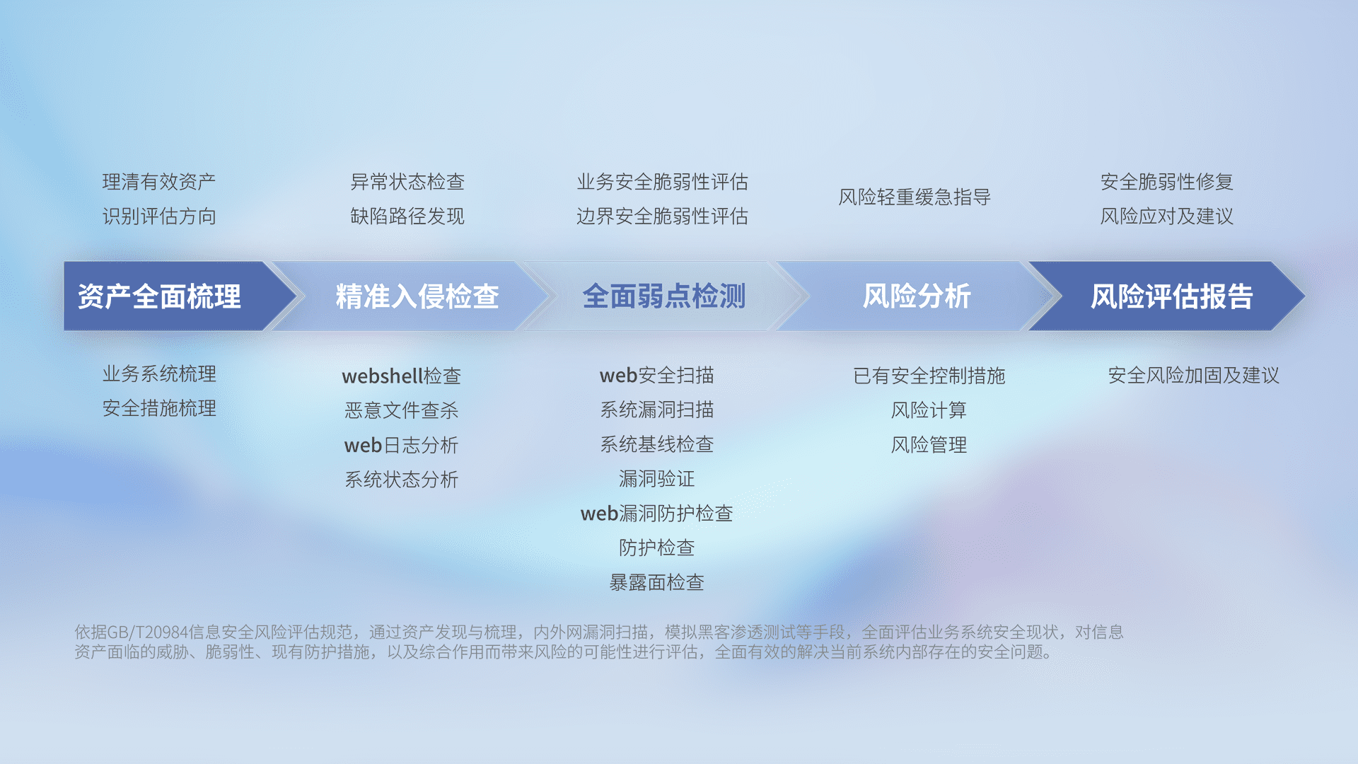 针对客户行业特性,,,,以专业的安全服务+多厂商联合解决方案提供专属的一站式安全管理服务,,帮助客户全面感知网络空间威胁,,,基于识别、、检测、、分析、、、防护、、、监测、、、、响应的服务理论模型,,从方案咨询、、、、集成交付、、、评估验证、、优化加固、、、、运维运营,,,致力于为客户提供完整的闭环管理式安全服务。。。。以实战经验为客户打造高抵御风险的安全体系,,,帮助客户发现威胁、、、对抗威胁、、、、处置威胁,,不断积累安全对抗能力,,,,持续保障数字化安全。。