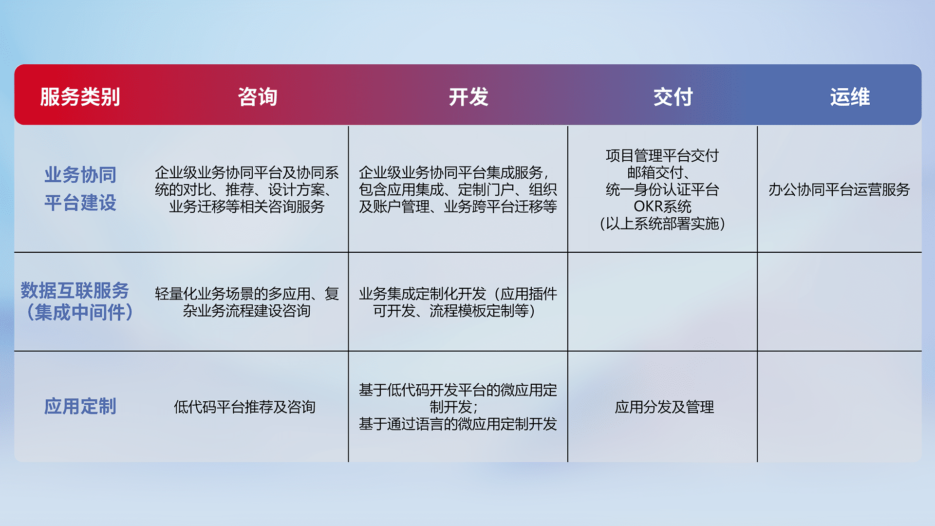 针对钉钉、、、、企微、、、、IDaas等平台级产品提供产品的规划、、、、方案、、、、交付、、、、定制化开发等服务,,,,实现如统一协同办公、、智能客户服务、、混合会议管理、、智能数据查询、、、等业务场景,,实现数字化转型。。。